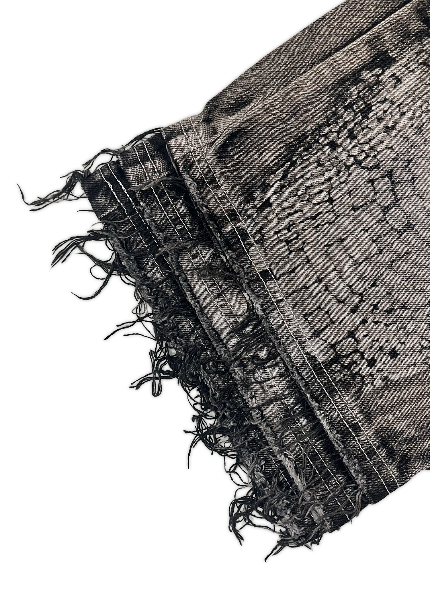 - Manually distressed triple layered leg openings